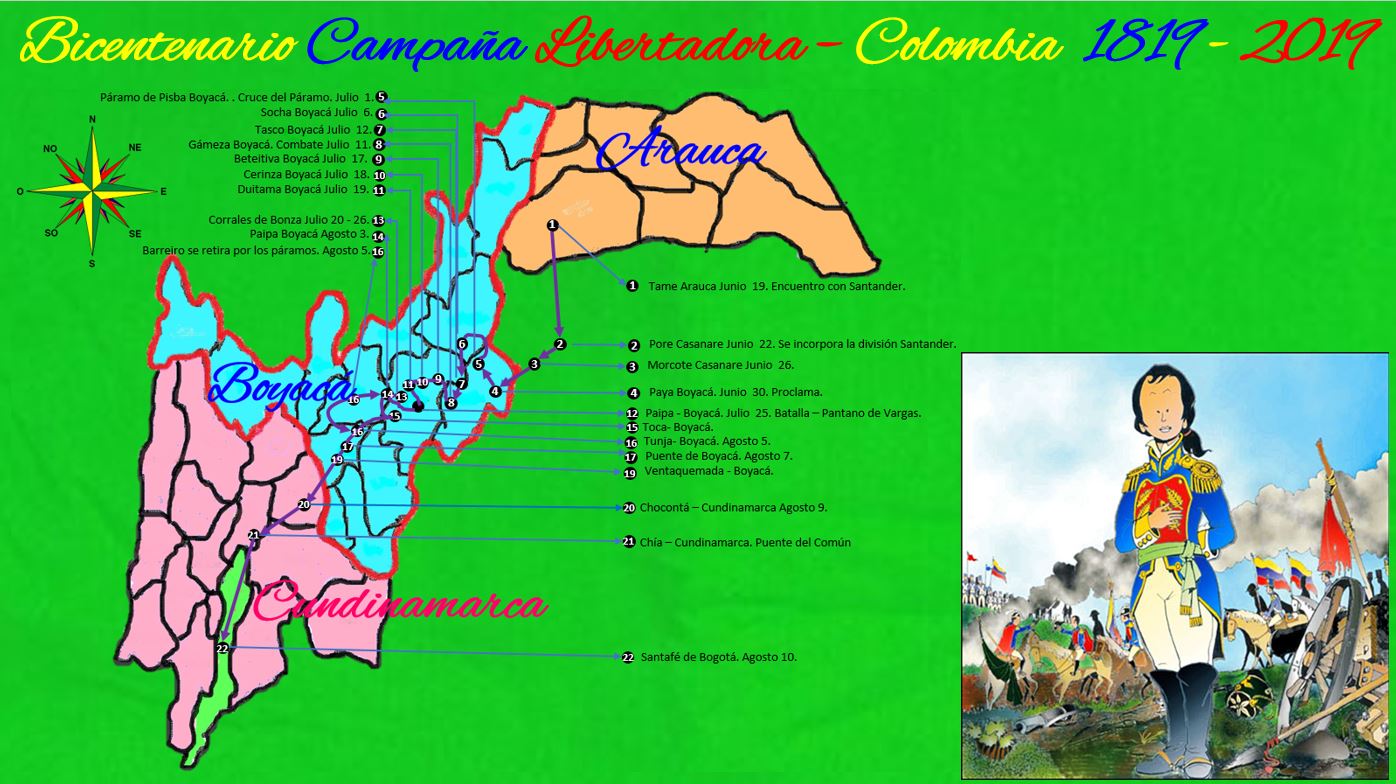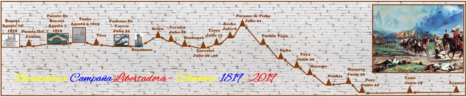 Un ejercito comandado por Simón bolívar cruzan las montañas que separan las provincias de Casanare y Tunja y tras las batallas de Paya, Pantano de Vargas y Puente de Boyacá. Tras ganar esta batalla, el libertador tiene vía libre para tomar el control de Santa Fe de Bogotá, ciudad a la que arriba triunfal el 10 de agosto de 1819.