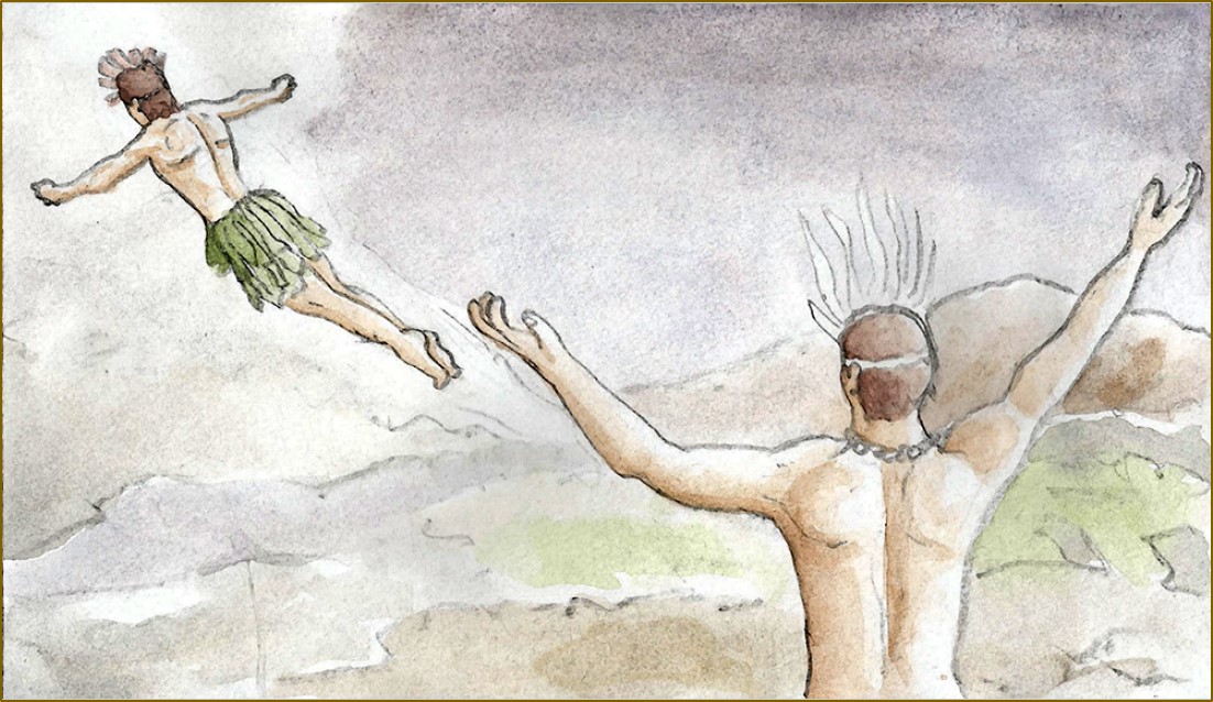 “Cuando amaneció y había cielo y tierra y todo lo demás de ellos y de ella, fuera del sol y la luna, y que así todo estaba en oscuridades en las cuales no había más personas que el cacique de Sogamoso y el de Ramiriquí o Tunja (porque en estos dos pueblos nunca hubo más que un cacique o señor y fue el que lo era de toda la provincia). Estos dos caciques dicen que hicieron a todas las personas, a los hombres de tierra amarilla y a las mujeres de una hierba alta que tiene un tronco hueco. Estaban todavía las tierras en tinieblas imparables los mando el cacique de Sogamoso al de Ramiriquí que era su sobrino, se subiese al cielo y alumbrase al mundo hecho sol, como lo hizo, pero viendo qué no era bastante para alumbrar la noche, subióse el mismo Sogamoso al cielo e hízose luna con que quedó la noche clara....